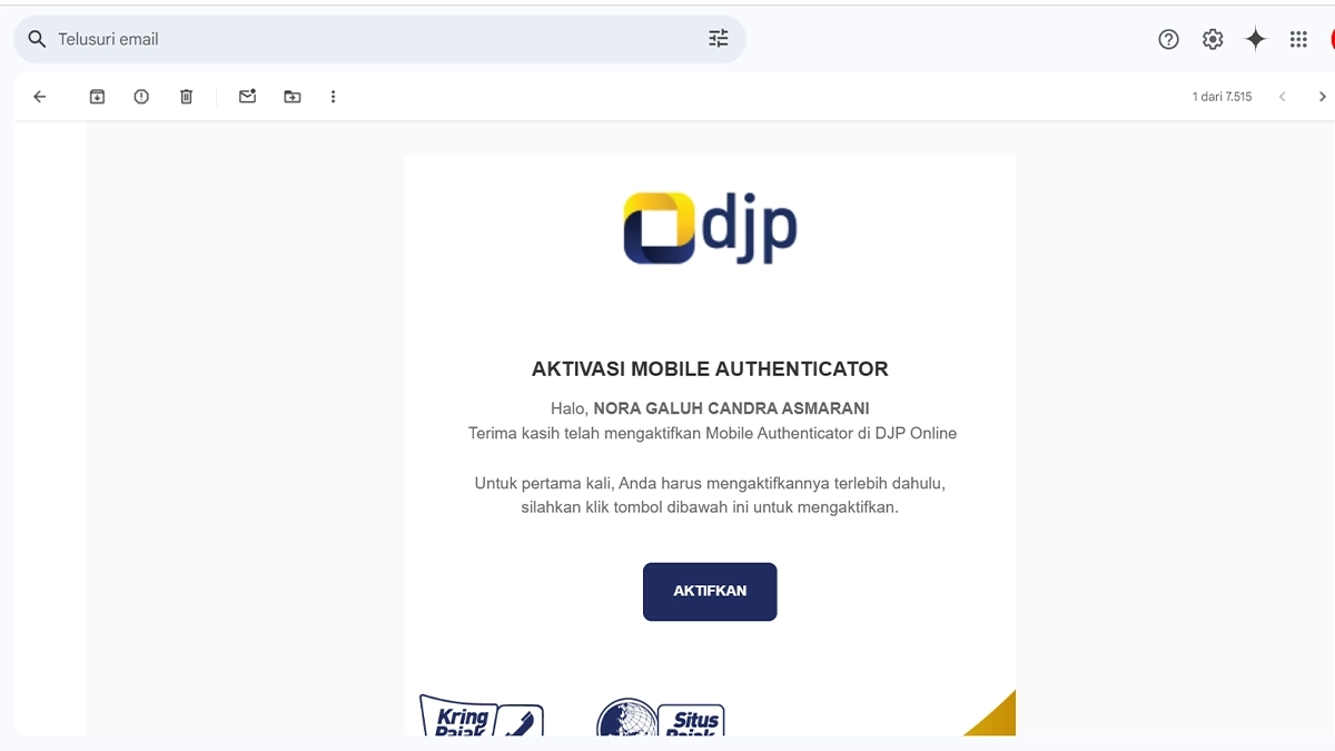 Untuk mengaktivasinya, Anda bisa memeriksa kotak masuk (inbox) email terdaftar untuk melihat pesan ‘Aktivasi Mobile Authenticator’ dari DJP dan tekan tombol Aktifkan. Jika email verifikasi mengalami kendala, Anda dapat melapor ke Kantor Pelayanan Pajak (KPP) terdekat untuk dibantu aktivasi mobile authenticator.