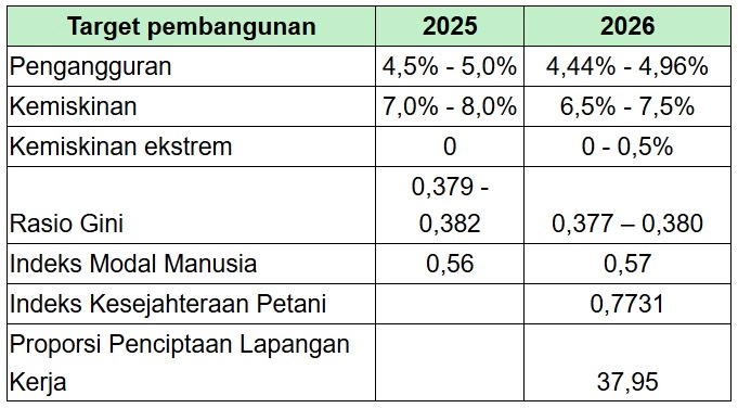 Sementara itu, Indeks Modal Manusia pada 2026 ditargetkan sebesar 0,57, Indeks Kesejahteraan Petani sebesar 0,7731, dan Proporsi Penciptaan Lapangan Kerja sebesar 37,95%.