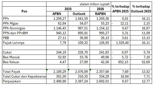 Meski demikian, perlu dicatat bahwa bila dibandingkan dengan target penerimaan pajak pada tahun ini, usulan target penerimaan pajak pada 2026 diketahui hanya bertumbuh sebesar 7,7%.