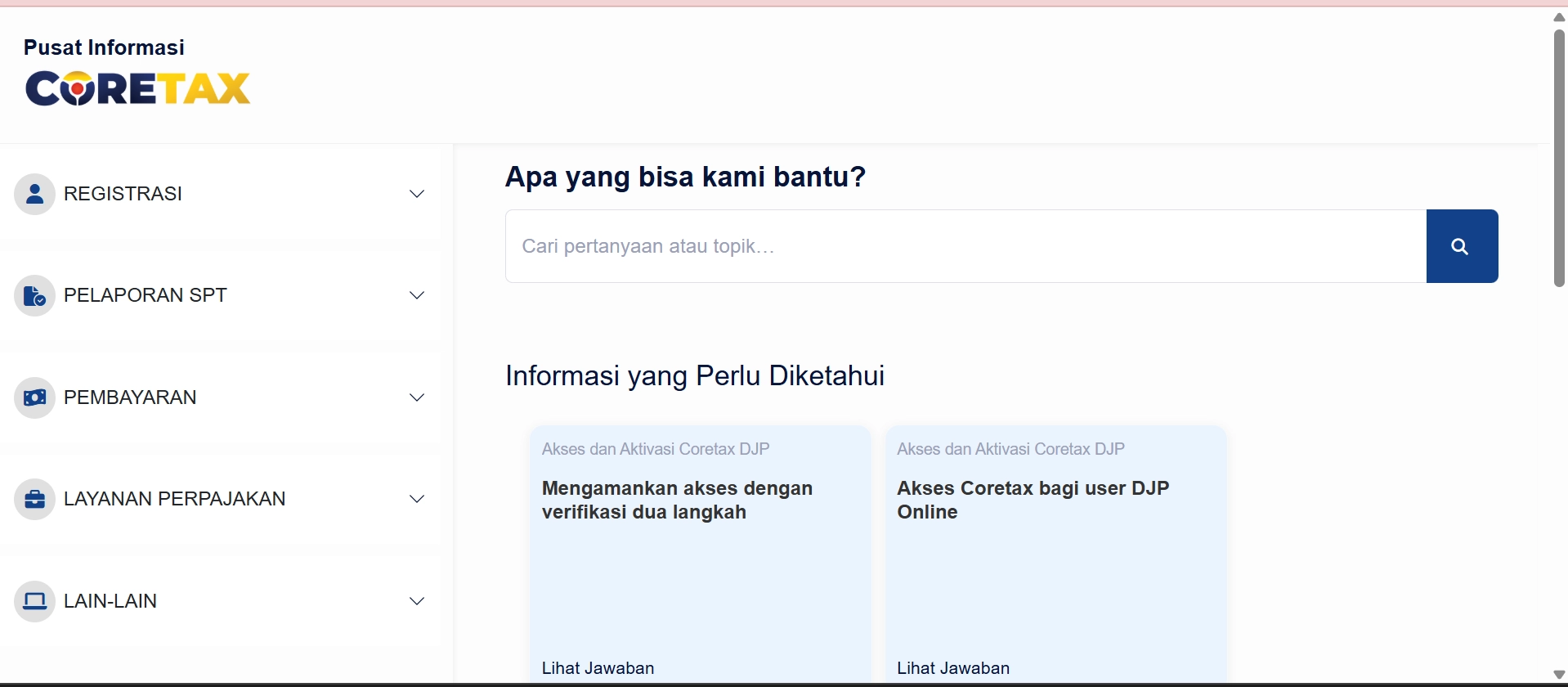 DJP menyebut pertanyaan dan jawaban yang terdapat pada laman Pusat Informasi Coretax akan diperbarui secara berkala. Pada saat artikel ini ditulis, ada 5 kategori pembahasan pada laman Pusat Informasi Coretax.