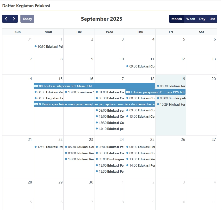 Wajib pajak dapat melihat detail jadwal sosialisasi yang diadakan DJP atau KPP melalui modul Layanan Wajib Pajak, menu Layanan Edukasi, dan submenu Jadwal Kegiatan Edukasi. Melalui menu tersebut, wajib pajak juga dapat melakukan reservasi.