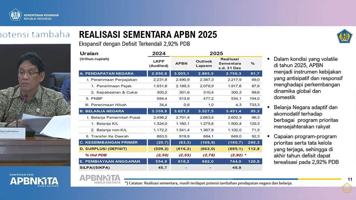 "Defisit membesar ke Rp695,1 triliun, lebih tinggi dibanding target APBN Rp662 triliun. Tapi kita tetap jaga, pastikan defisit tidak di atas 3%. Defisit memang naik ke 2,92% dari rencana awal 2,78%," katanya dalam Konpers APBN Kita, Kamis (8/1/2026).