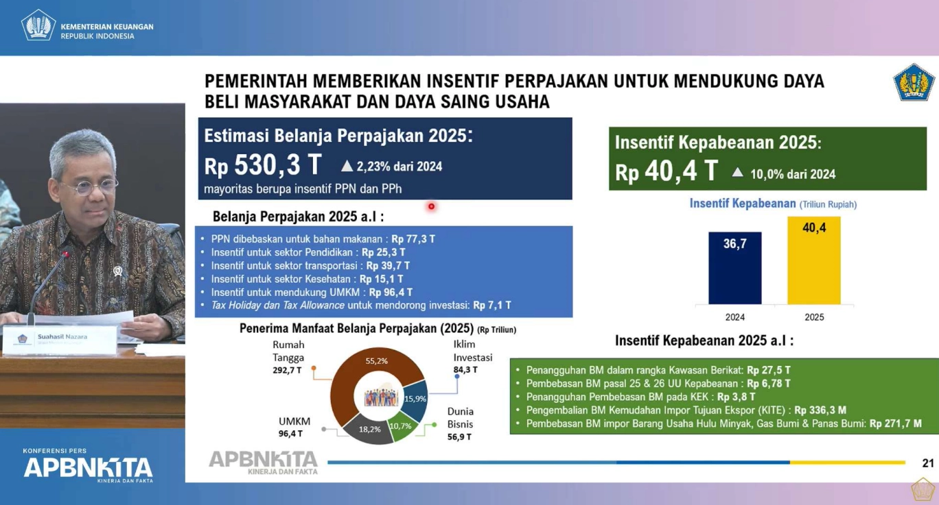 "Rp530,3 triliun adalah estimasi belanja perpajakan 2025 dan kalau kita kategorikan menurut penerima manfaatnya ada yang diterima oleh rumah tangga karena bebas PPh dan PPN, ada yang oleh UMKM, ada yang untuk memperkuat iklim investasi, maupun yang diterima oleh dunia bisnis," ujar Suahasil. (dik)