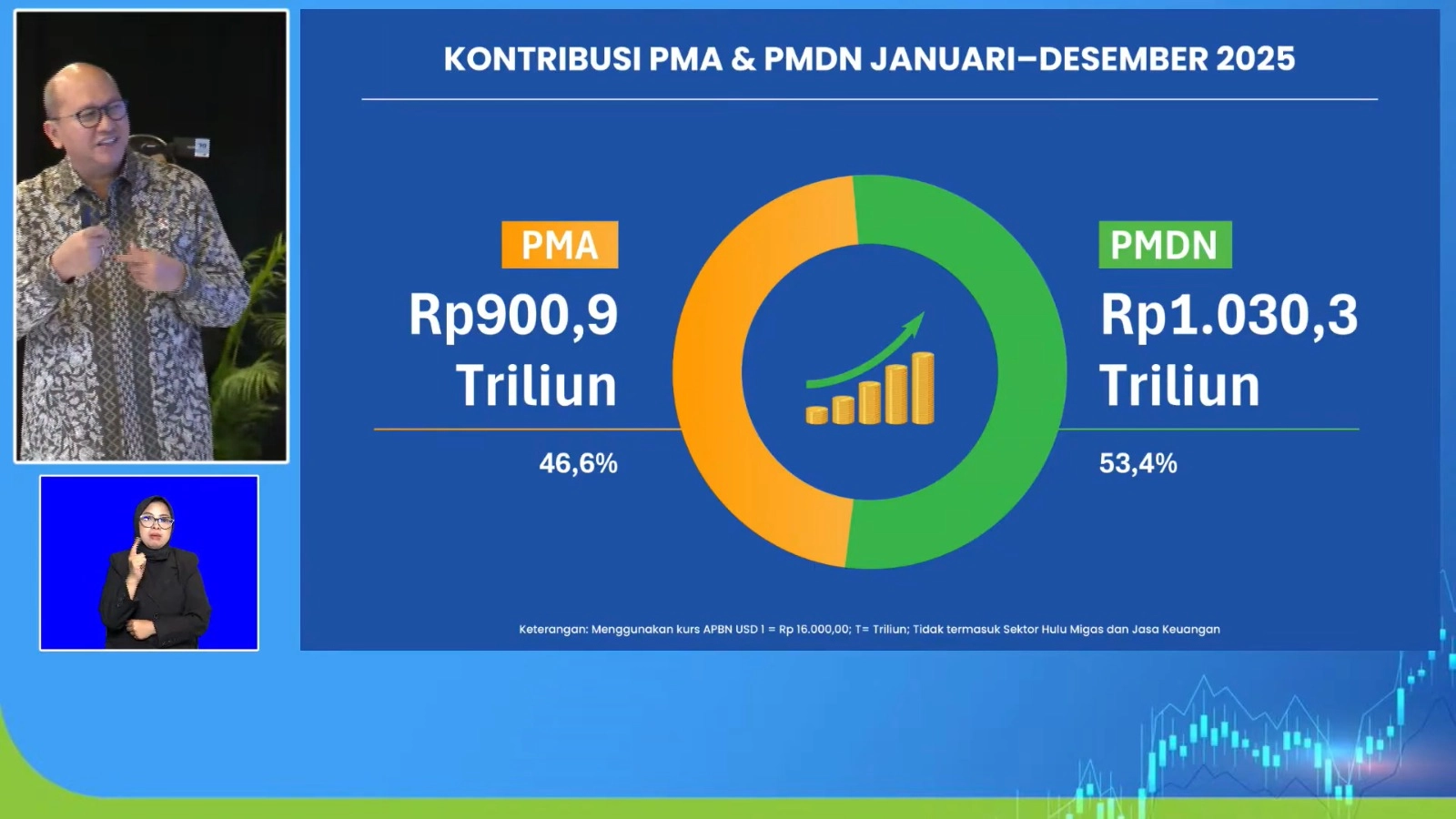 Meski PMDN meningkat pesat, penanaman modal asing (PMA) tercatat bertumbuh stagnan sebesar 0,1% dengan realisasi hanya senilai Rp900,9 triliun sepanjang 2025.