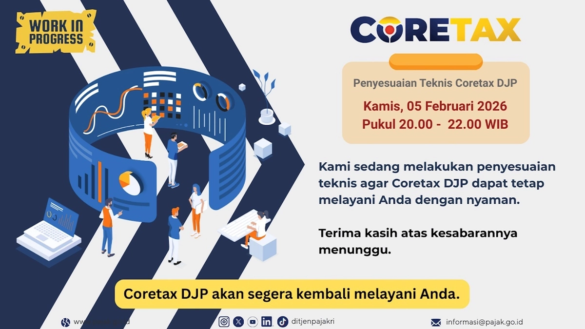 "Kami sedang melakukan penyesuaian teknis agar Coretax DJP dapat tetap melayani Anda dengan nyaman. Terima kasih atas kesabarannya menunggu," tulis DJP dalam pengumumannya, Kamis (5/2/2026).