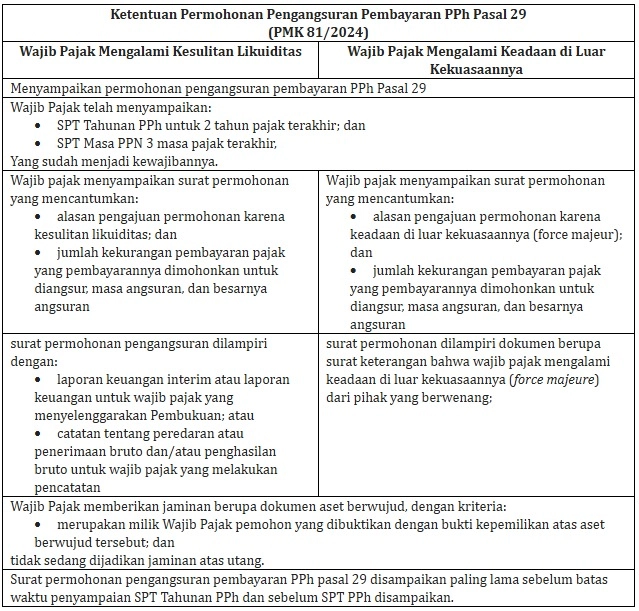 Dalam perkembangannya, ketentuan teknis mengenai permohonan angsuran pembayaran PPh Pasal 29 kini diatur dalam PMK 81/2024. Berdasarkan Pasal 113 huruf a PMK 81/2024, permohonan angsuran pembayaran PPh Pasal 29 dapat diajukan oleh: