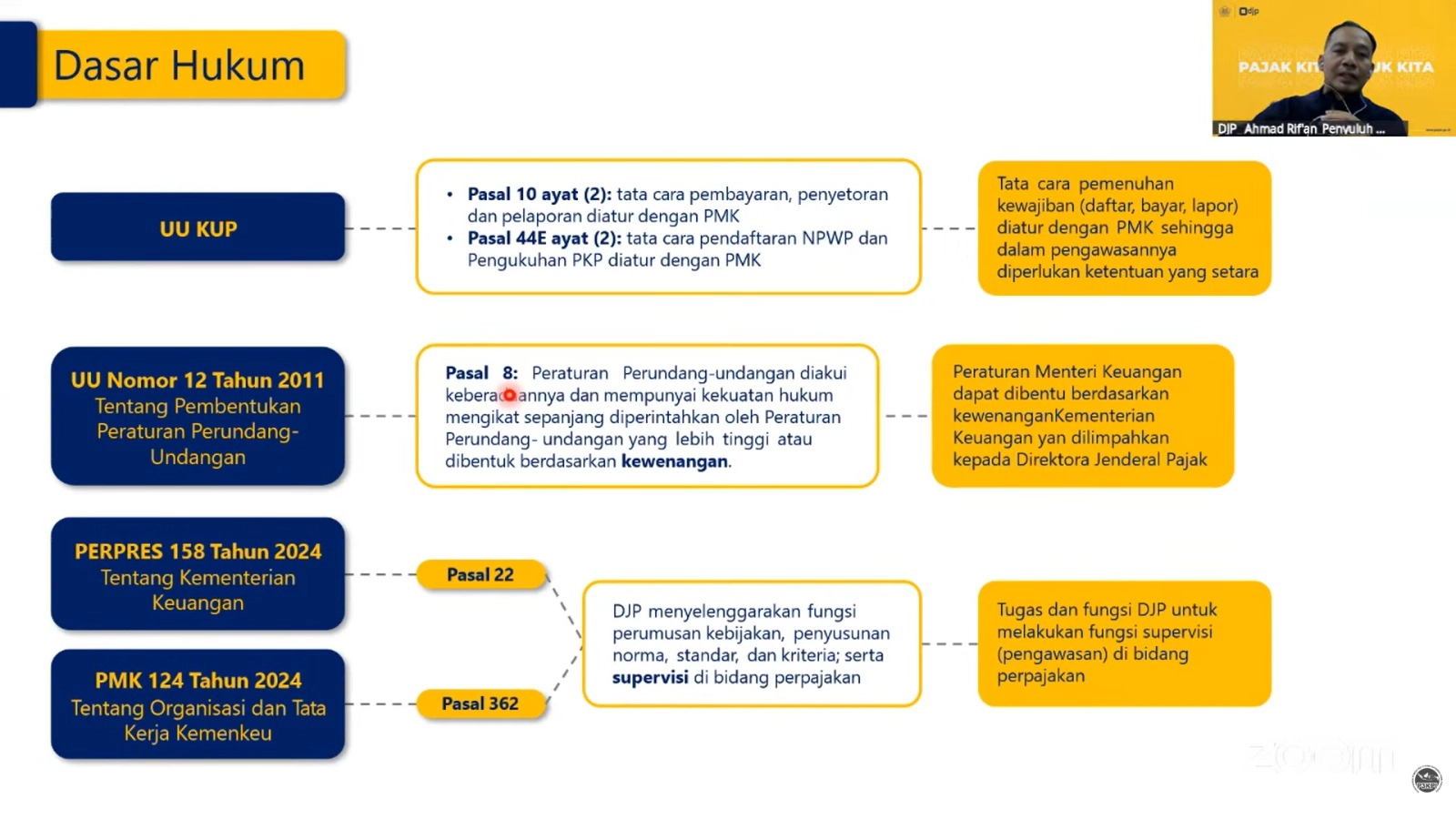 Merujuk pada Pasal 22 Perpres 158/2024 dan Pasal 362 PMK 124/2024, Kementerian Keuangan telah melimpahkan kewenangan untuk melakukan supervisi di bidang perpajakan kepada DJP.