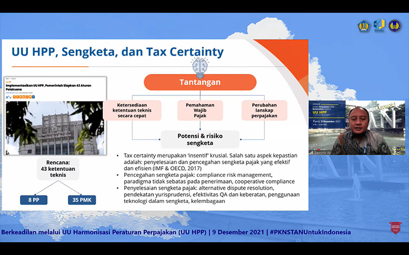 Dalam webinar Sistem Perpajakan yang Berkeadilan melalui UU HPP yang diadakan Tax Center PKN STAN, Bawono menilai UU HPP dan reformasi perpajakan ke depannya perlu dibarengi dengan upaya-upaya untuk mencegah serta menyelesaikan sengketa pajak secara efektif dan efisien.