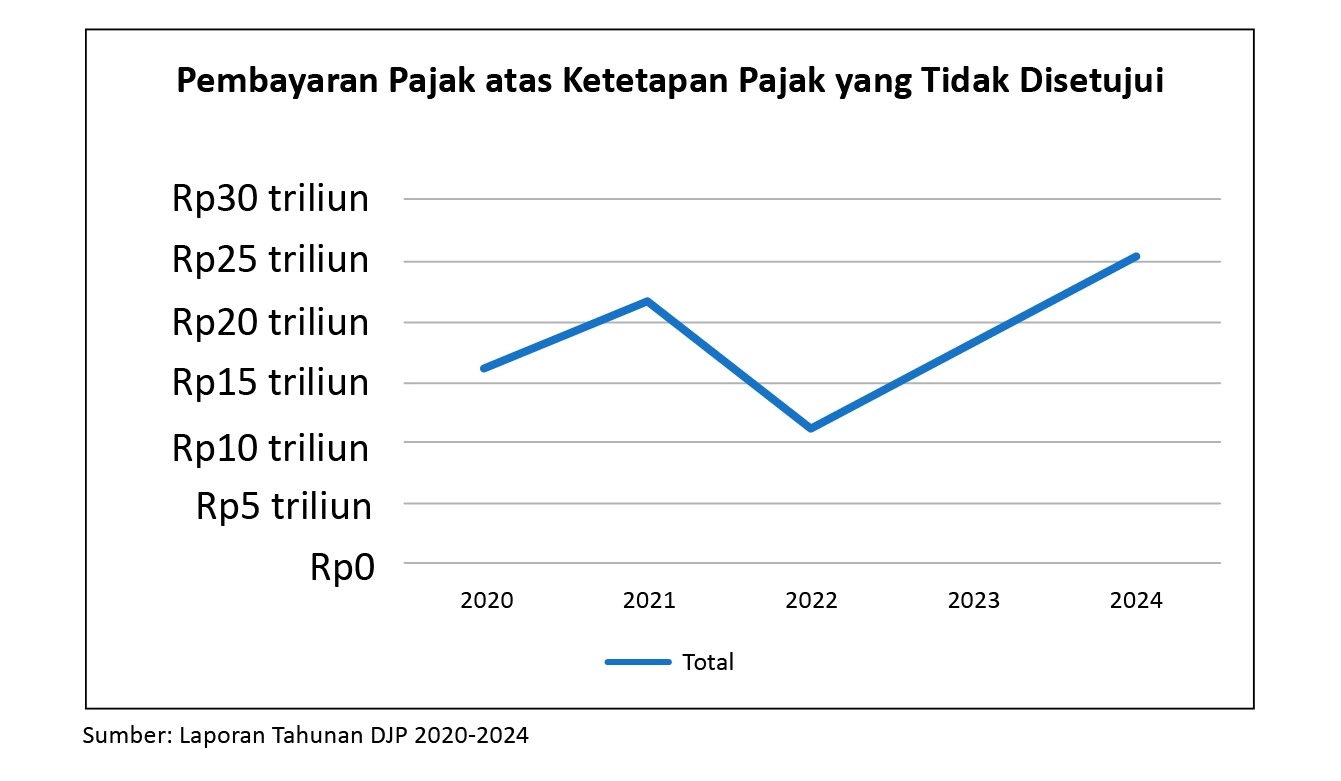 Merujuk pada laporan keuangan yang dipublikasikan oleh DJP, diketahui bahwa nilai pembayaran pajak atas jumlah pajak dalam ketetapan pajak yang tidak disetujui oleh wajib pajak cenderung meningkat dari tahun ke tahun.