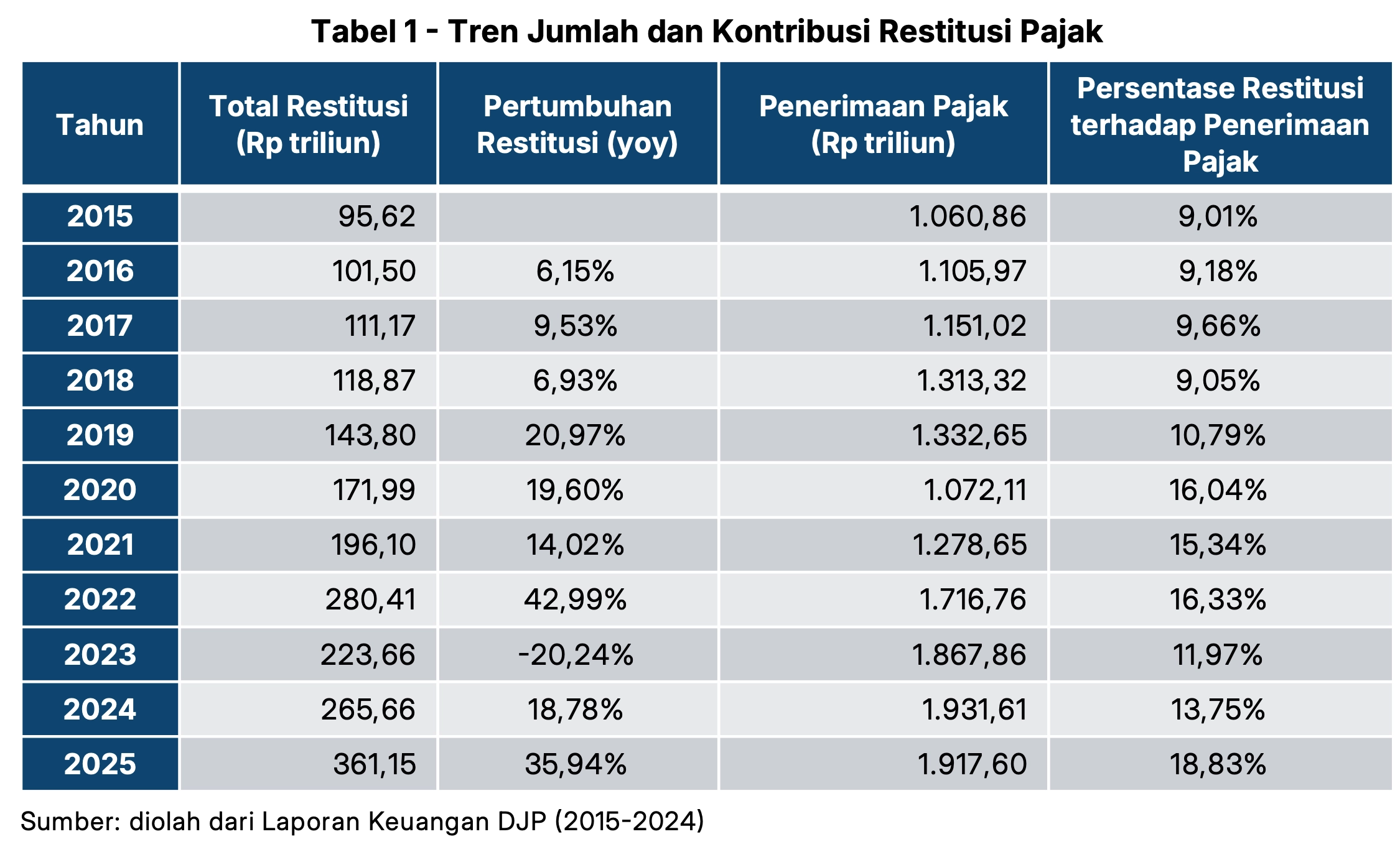 Dalam 1 dekade terakhir, restitusi pajak di Indonesia mengalami peningkatan signifikan. Hal ini mencerminkan sejumlah faktor, antara lain dinamika perekonomian domestik, kondisi dunia usaha, fluktuasi harga komoditas, serta perubahan kebijakan fiskal dan tata laksana administrasi perpajakan.