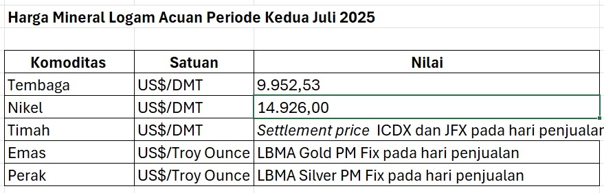 Selain HBA, KEP 244.K/MB.01/MEM.B/2025 turut menetapkan harga mineral logam acuan (HMA) beberapa komoditas lain untuk periode II Juli 2025. Berikut ini perinciannya: