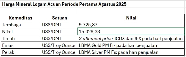 Selain HBA, KEP 261.K/MB.01/MEM.B/2025 turut menetapkan harga mineral logam acuan (HMA) beberapa komoditas lain untuk periode I Agustus 2025. Berikut ini perinciannya: