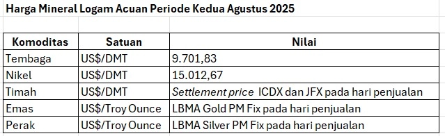 Selain HBA, KEP 271.K/MB.01/MEM.B/2025 turut menetapkan harga mineral logam acuan (HMA) beberapa komoditas lain untuk periode II Agustus 2025. Berikut ini perinciannya: