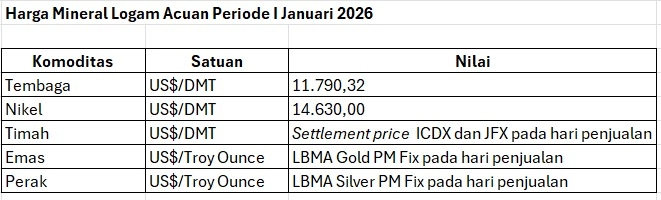 Selain HBA, KEP 458.K/MB.01/MEM.B/2025 turut menetapkan harga mineral logam acuan (HMA) beberapa komoditas lain untuk periode I Januari 2026. Berikut ini perinciannya: