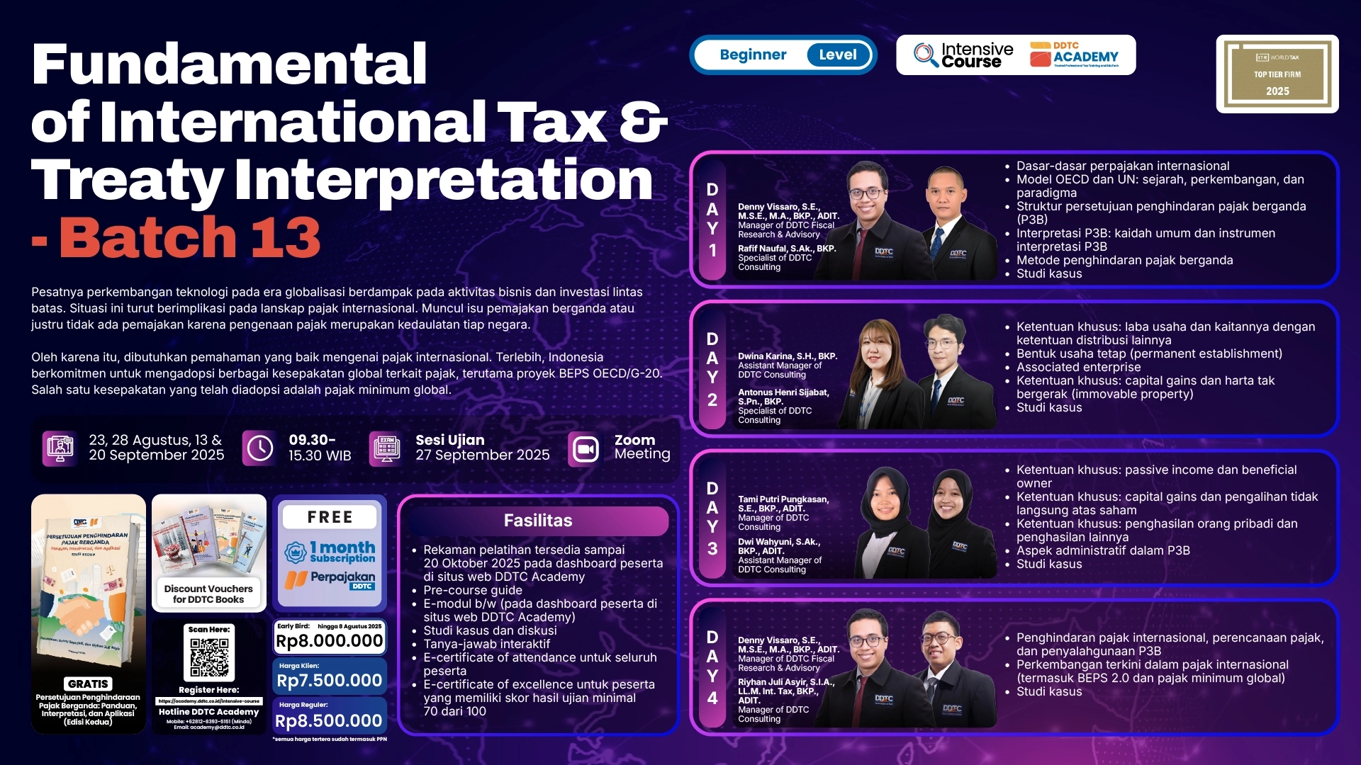 Dengan urgensi tersebut, DDTC Academy kembali menggelar Intensive Course bertajuk Fundamental of International Tax and Treaty Interpretation (Batch 13). Acara ini akan dilaksanakan secara online via Zoom Meeting sebanyak 4 kali pertemuan dan 1 sesi ujian.