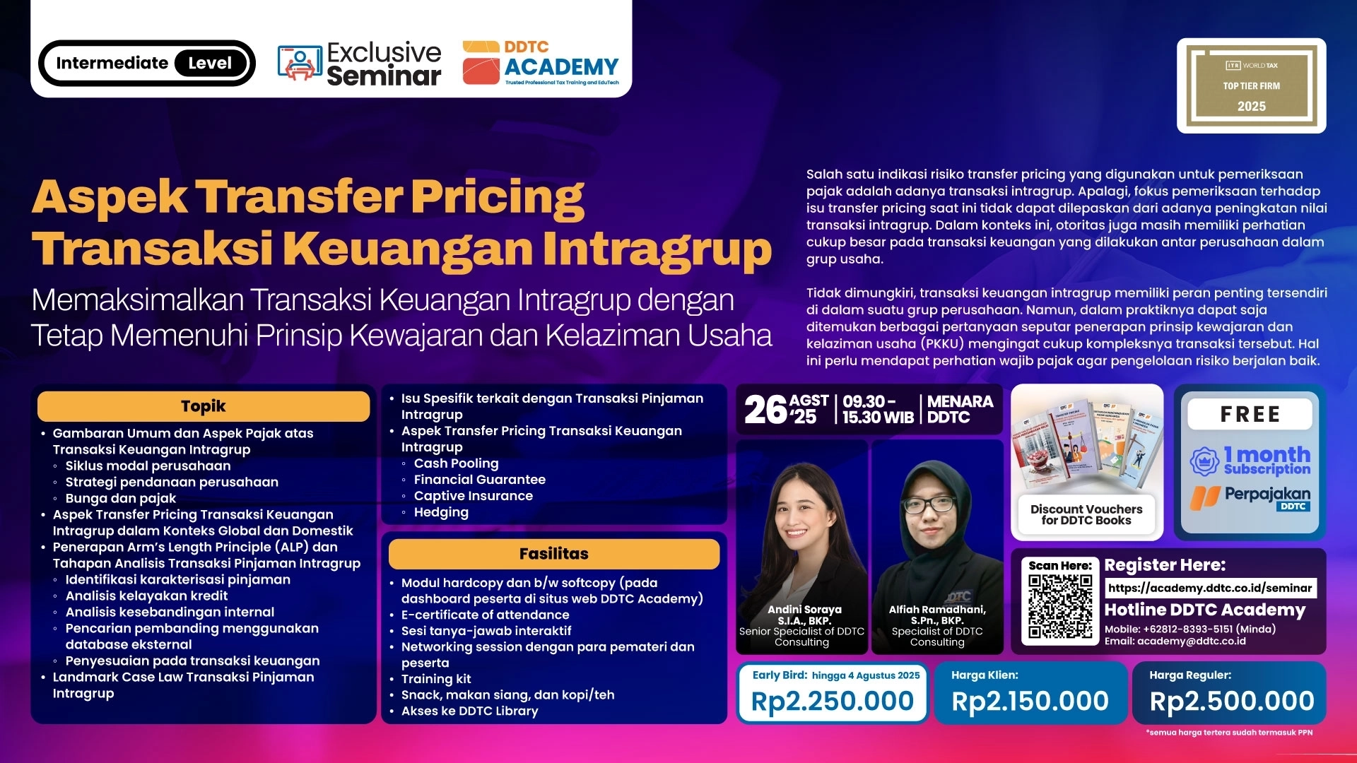 JANGAN lewatkan! Pendaftaran exclusive seminar DDTC Academy bertajuk Aspek Transfer Pricing Transaksi Keuangan Intragrup: Memaksimalkan Transaksi Keuangan Intragrup dengan Tetap Memenuhi Prinsip Kewajaran dan Kelaziman Usaha masih terbuka, tetapi hanya beberapa jam lagi.