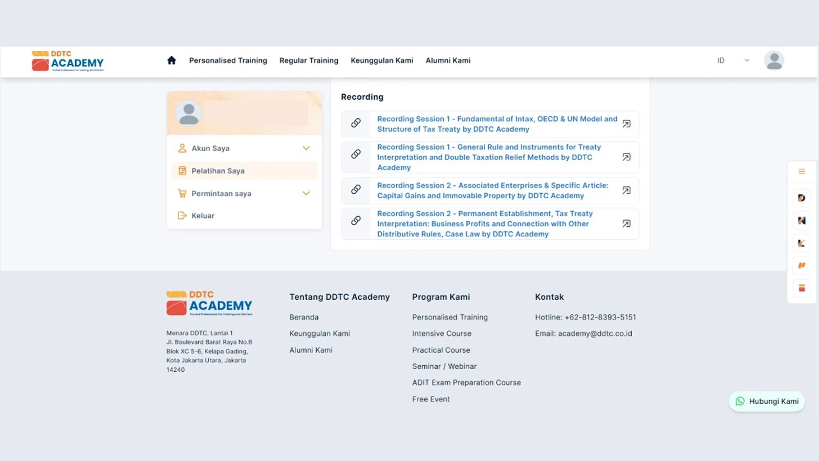 Peserta intensive course akan mendapatkan fasilitas rekaman seluruh sesi pelatihan yang dapat diakses melalui dashboard DDTC Academy sampai dengan 20 Oktober 2025. Saat ini rekaman sesi pertama dan kedua sudah tersedia.