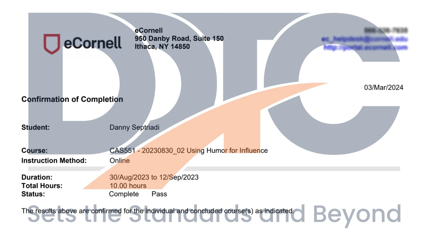 Sertifikat Danny Septriadi di kursus Using Humor for Influence dari eCornell.