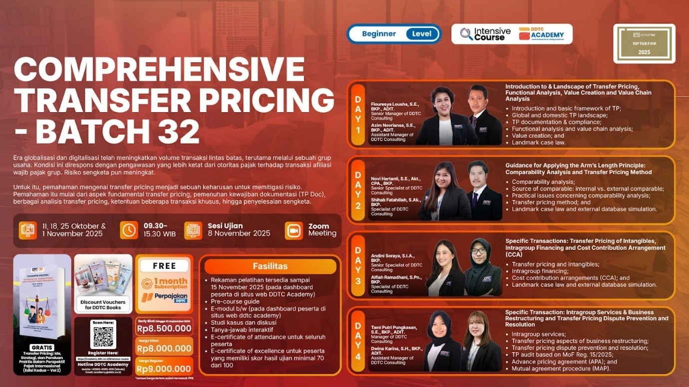 Selain practical course di atas, DDTC Academy kembali menghadirkan salah satu program unggulannya yaitu intensive course bertajuk Comprehensive Transfer Pricing (Batch 32). Acara akan dilaksanakan secara online via Zoom Meeting sebanyak 4 kali pertemuan dan 1 sesi ujian. Daftar melalui situs web DDTC Academy.