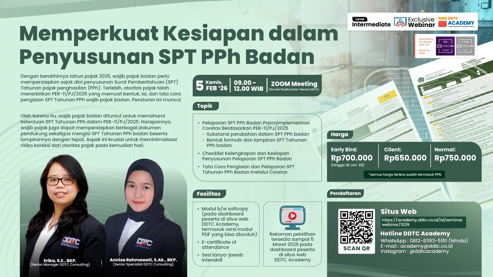 Adapun bentuk formulir dan lampiran SPT Tahunan PPh wajib pajak badan juga akan diulas dalam exclusive webinar DDTC Academy bertajuk Memperkuat Kesiapan dalam Penyusunan SPT PPh Badan. Acara ini akan digelar pada, 5 Februari 2026 pukul 09.00-12.00 WIB secara online melalui Zoom (live dari studio lantai 1 Menara DDTC).