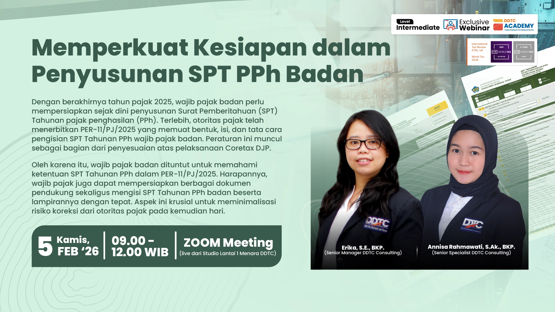 TINGGAL beberapa jam lagi bagi Anda untuk mendaftar exclusive webinar DDTC Academy bertajuk Memperkuat Kesiapan dalam Penyusunan SPT PPh Badan. Pendaftaran akan ditutup pada hari ini, Rabu, 4 Februari 2026 pukul 14.00 WIB. Daftar melalui situs web DDTC Academy.