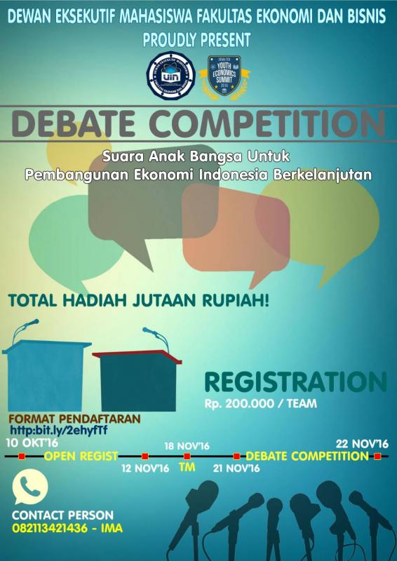 Lomba yang menawarkan hadiah total senilai Rp3 juta ini akan digelar pada 21 – 22 November 2016 bertempat di Kampus FEB, UIN Syarif Hidayatullah, Jakarta.