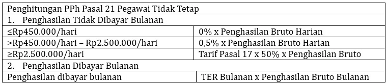 Penghasilan yang diterima pegawai tidak tetap dapat berupa: upah harian, upah mingguan, upah satuan, upah borongan, dan upah yang diterima/diperoleh secara bulanan. Semenjak berlakunya tarif efektif rata-rata (TER), formula penghitungan PPh Pasal 21 bagi pegawai tetap dapat dirangkum menjadi sebagai berikut: