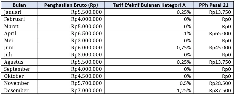Misal, Tuan Abdullah merupakan pegawai tidak tetap bekerja sebagai buruh kemas barang di PT Katastima. Tuan Abdullah berstatus tidak menikah dan tidak memiliki tanggungan. Sebagai pegawai tidak tetap, Tuan Abdullah menerima penghasilan yang dibayarkan secara bulanan berdasarkan jumlah barang yang ia kemas.