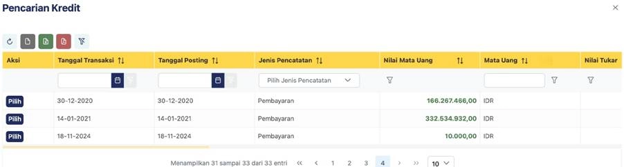 Kemudian, sistem akan memunculkan pop-up windows Pencarian Kredit. Pada pop-up windows tersebu, pilih kredit pajak yang akan dipindahbukukan dengan cara menekan tombol Pilih.