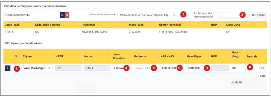 Lalu, pilih Jenis Kewajiban [4], Referensi [5], Kode Akun Pajak/Kode Jenis Setor (KAP-KJS) [6], Masa Pajak [7], dan Jumlah [8]. Untuk memperjelas, berikut contoh pengisian alasan, jumlah yang akan dipindahbukukan, dan tujuan pemindahbukuan.