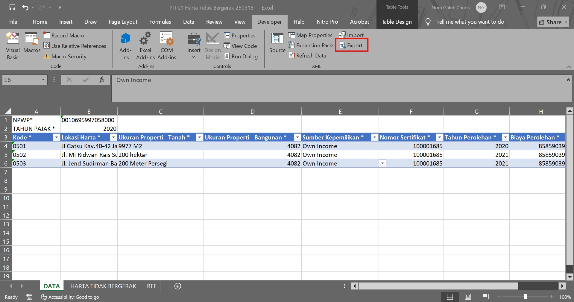 Untuk mengubah file excel ke dalam format XML, pilih menu Developer dan klik Export. Tuliskan nama file (misal L1 Harta Tidak Bergerak) dan pilih lokasi penyimpanan file, lalu klik Export. Data harta Anda siap untuk diimpor melalui coretax.