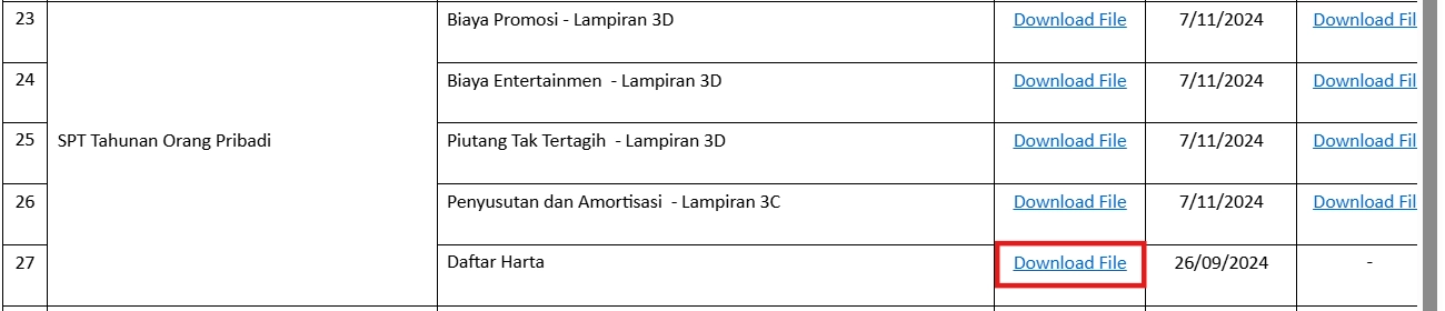 Pada halaman tersebut, gulir halaman ke bawah menuju kategori SPT tahunan Orang Pribadi. Lalu, pada baris Daftar Harta klik ‘Download File’ yang ada di kolom Converter XML. Sistem akan otomatis mengunduh template XML daftar harta dalam format WinRAR.