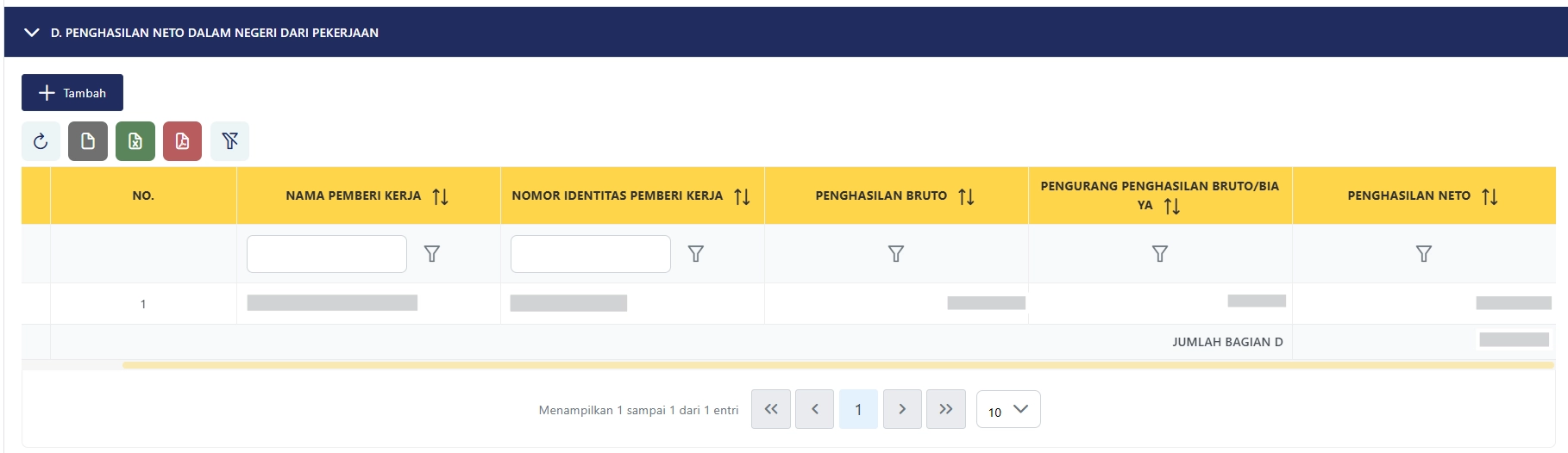 Selanjutnya, pindah ke tab L-1 dan gulir halaman ke bawah menuju bagian D. Penghasilan Neto Dalam Negeri Dari Pekerjaan. Tabel pada Lampiran 1 Bagian D tersebut akan terisi otomatis berdasarkan data penghasilan di bukti potong yang telah diterbitkan oleh pemberi penghasilan.