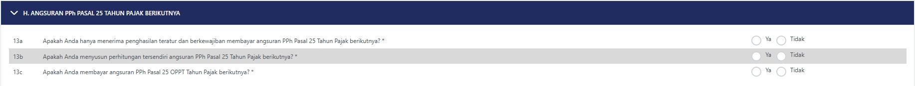 Bagian ini digunakan untuk menghitung angsuran PPh Pasal 25 tahun pajak berikutnya bagi wajib pajak yang hanya menerima penghasilan teratur dan berkewajiban membayar angsuran PPh Pasal 25 tahun pajak berikutnya. Jawaban pertanyaan ini diisi dengan memilih: