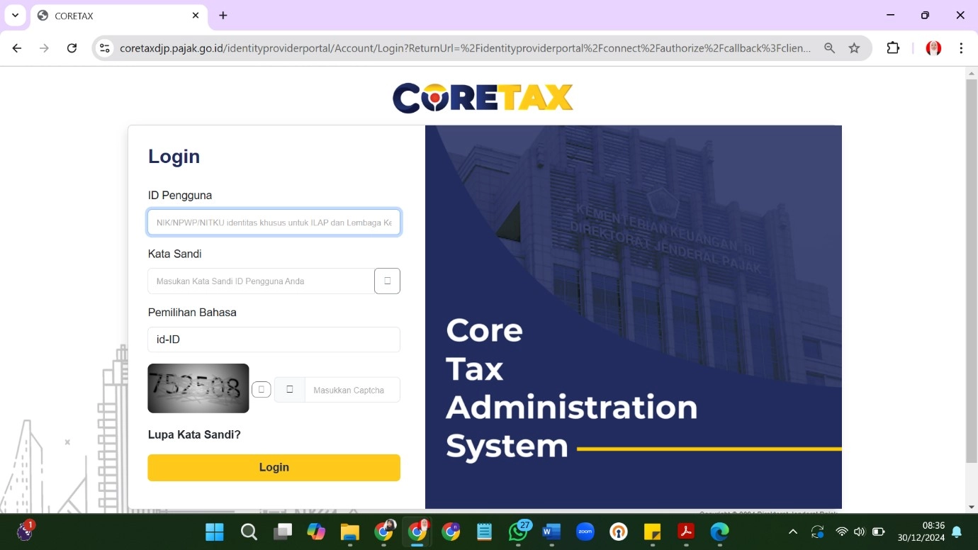 Sistem akan secara otomatis mengarahkan Ibu Rika ke halaman login coretax. Pada halaman tersebut, masukkan NPWP 16 digit pada kolom ID pengguna, password DJP Online pada kolom Kata Sandi, isikan kode captcha yang muncul, lalu klik Login.