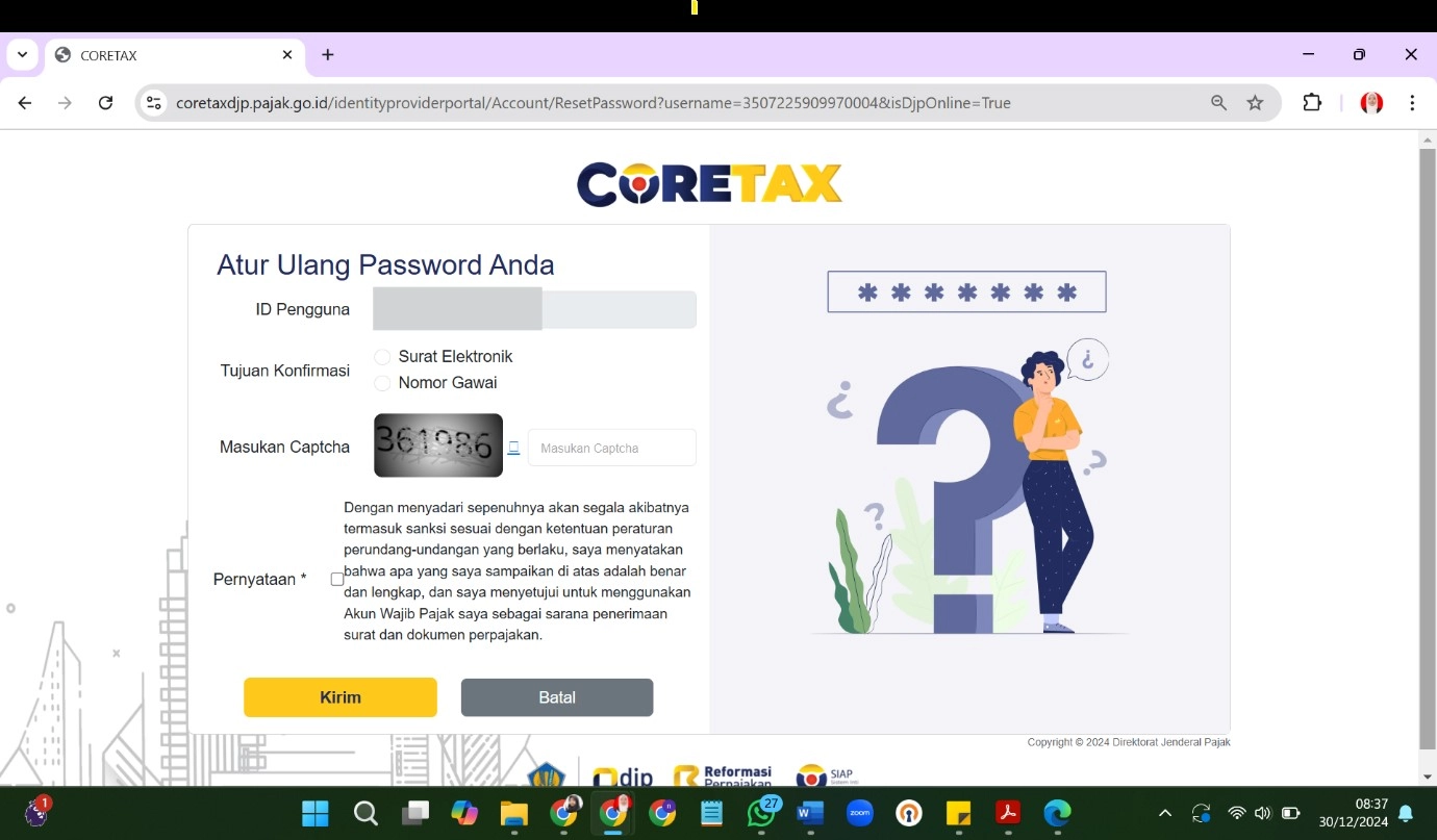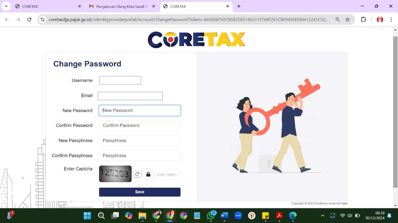 Pada halaman pengaturan kata sandi, buatlah kata sandi untuk akun coretax sesuai dengan ketentuan. Saat melakukan perubahan kata sandi, Ibu Rika juga akan diminta mengisi frasa sandi (passphrase). DJP menyarankan agar passphrase tersebut tidak sama dengan kata sandi karena akan digunakan sebagai pengganti tanda tangan digital dalam memanfaatkan layanan yang disediakan oleh coretax DJP.