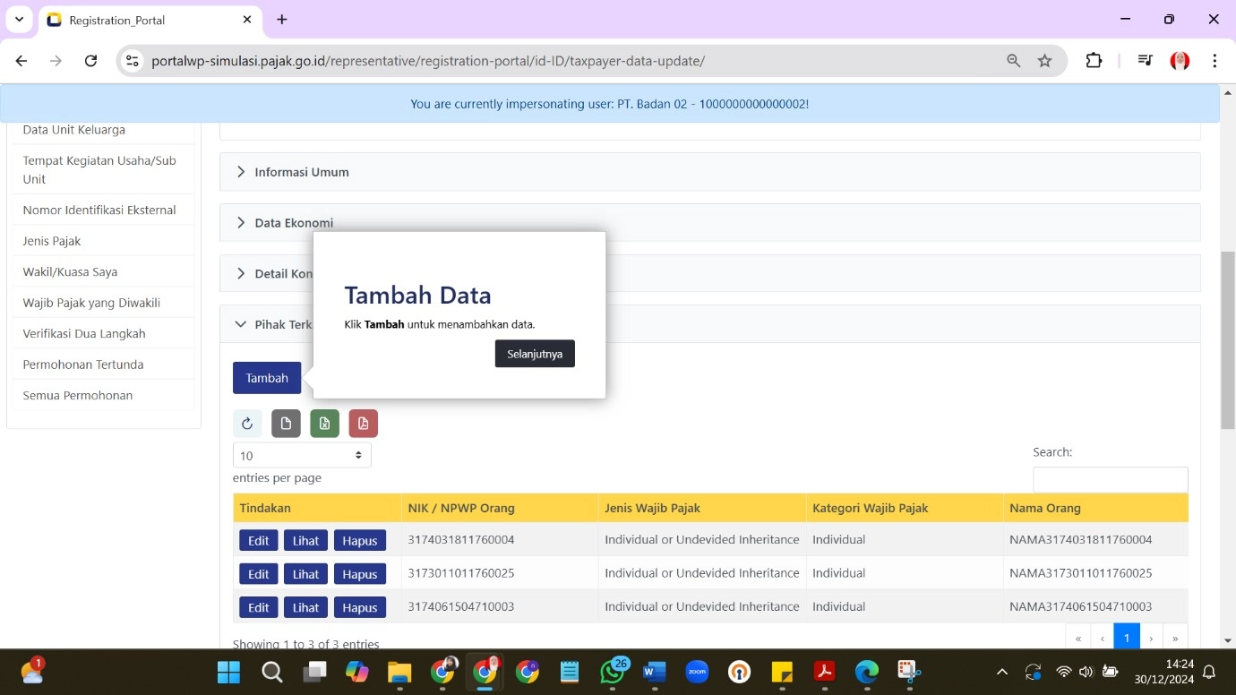 Mengacu pada tutorial DJP, pemberian hak akses tersebut nantinya bisa dilakukan dengan menambahkan karyawan sebagai pihak terkait. Penambahan itu dilakukan melalui menu informasi umum pada halaman profil wajib pajak dan klik tombol edit. Selanjutnya, gulirkan halaman ke bawah hingga menemukan submenu Pihak Terkait dan klik Tambah.