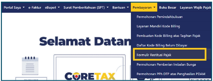 Mula-mula, buka coretax melalui laman https://coretaxdjp.pajak.go.id/ dan login ke akun Coretax DJP. Apabila bapak Nugroho mewakili perusahaan tempat Bapak bekerja maka jangan lupa untuk melakukan impersonate dari akun utama ke akun coretax perusahaan. Untuk mengajukan permohonan PPYSTT, Bapak Nugroho dapat memilih menu Pembayaran dan submenu Formulir Restitusi Pajak.