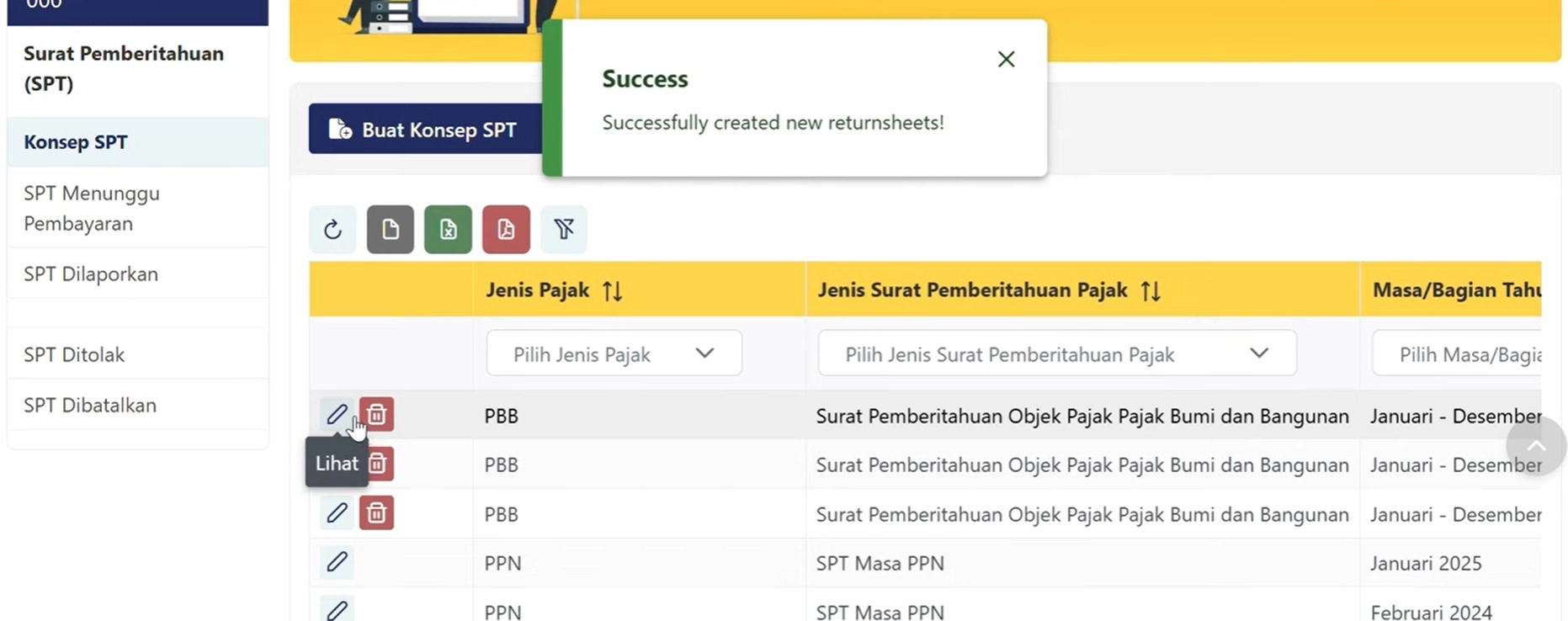 Ketiga, pilih 'Buat Konsep SPT', lalu Bapak pilih jenis SPT yang akan dilaporkan, yaitu PBB.